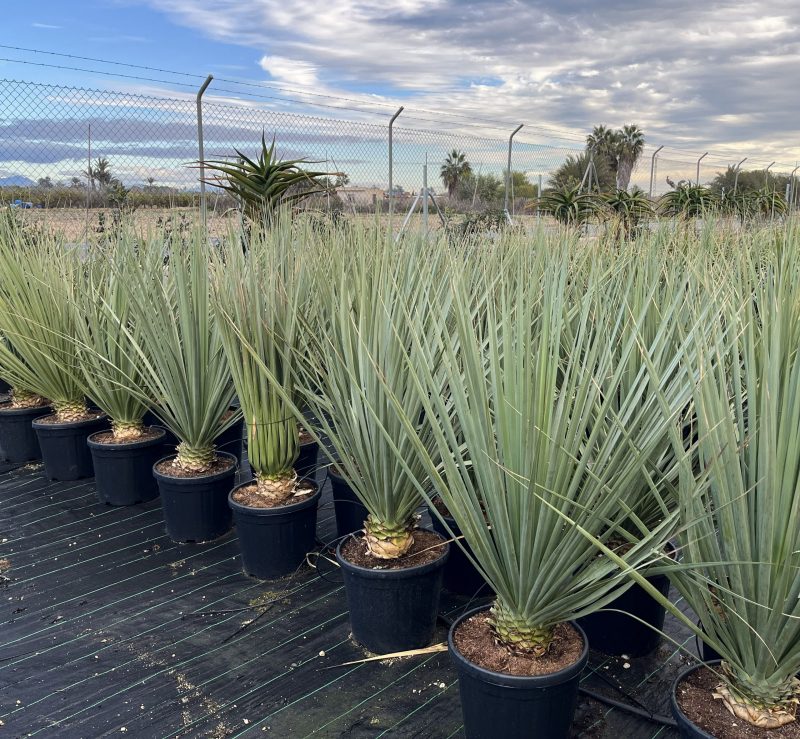 La Nolina longifolia presenta hojas largas que caen formando una falda vegetal. Prefiere pleno sol y riego bajo.